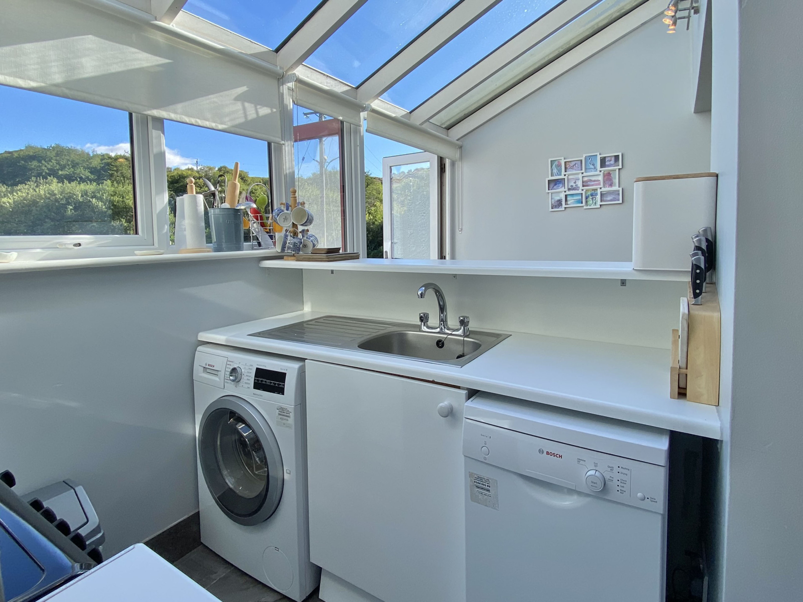 Det amerikanske køkken, med service og køleskab, mikroovn, ovn, fryser, opvaskemaskine, tallerkener/bestik, køkkenredskaber, brødrister og kedel.