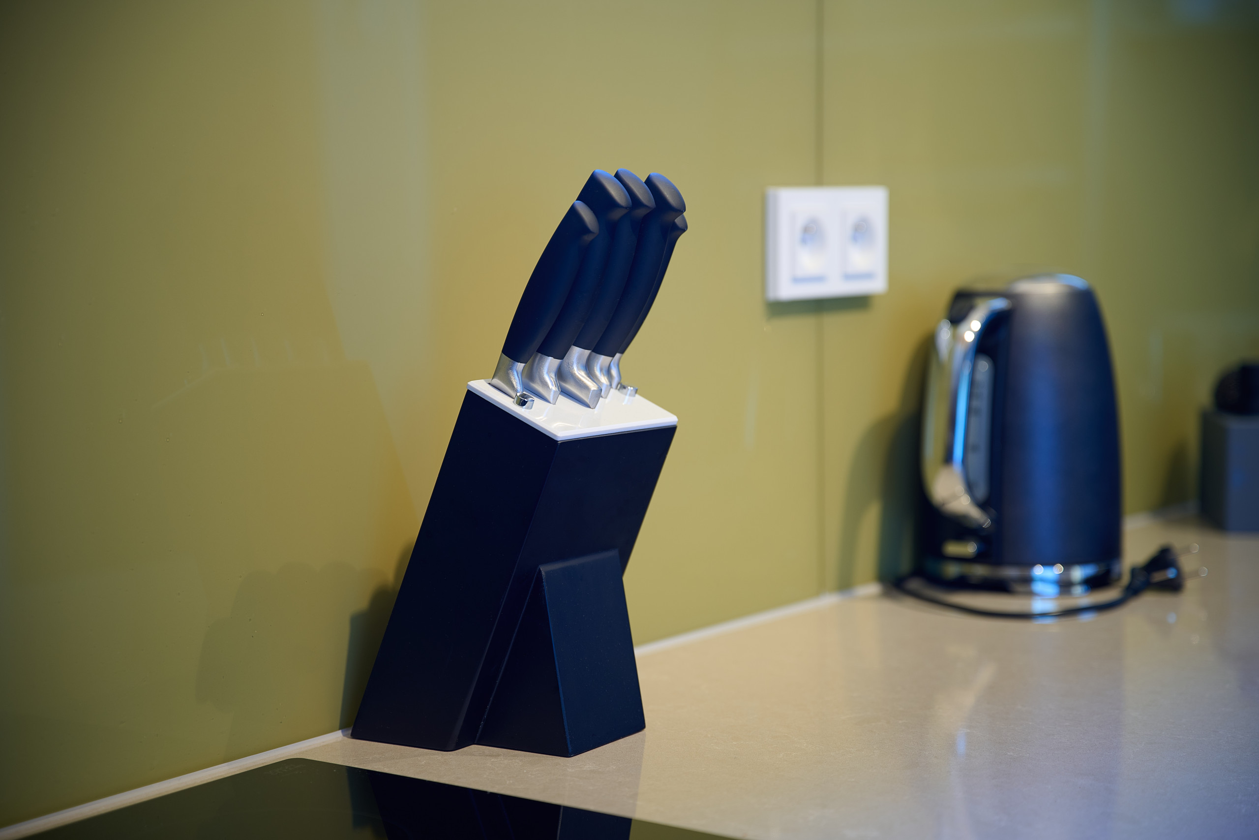 Det amerikanske køkken med keramiske kogeplader, med service og køleskab, mikroovn, ovn, fryser, opvaskemaskine, tallerkener/bestik, køkkenredskaber, kaffemaskine og kedel.