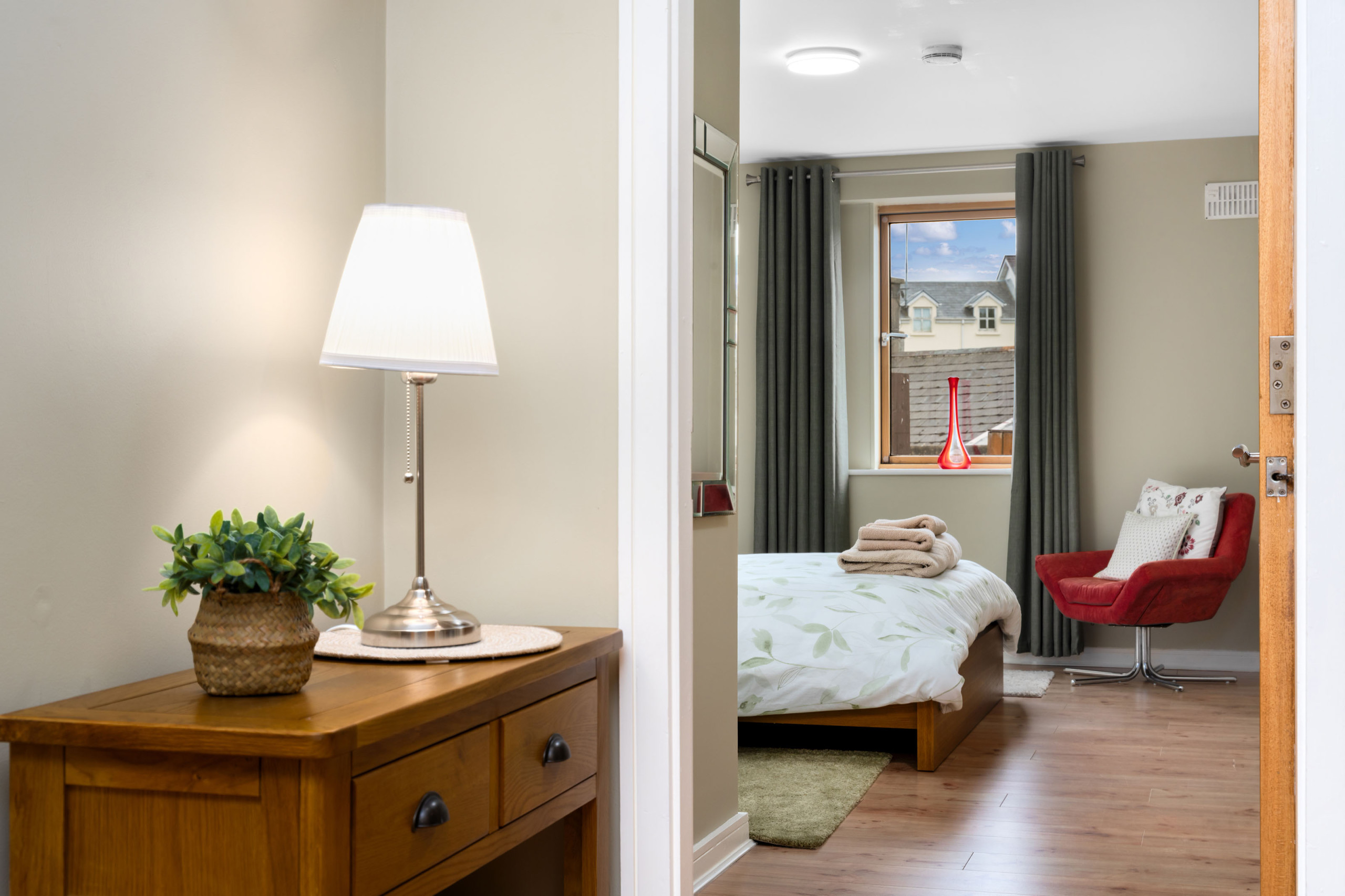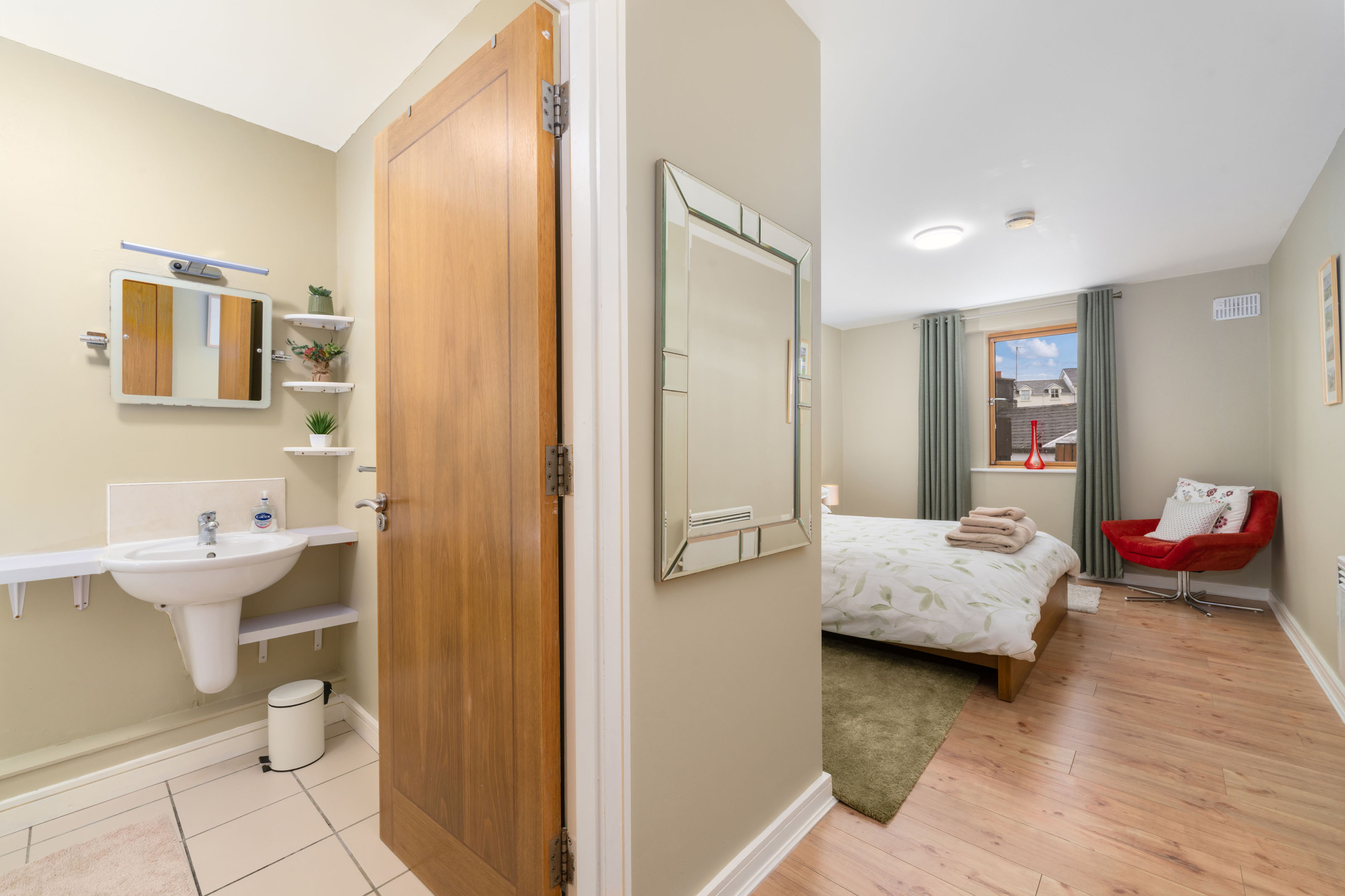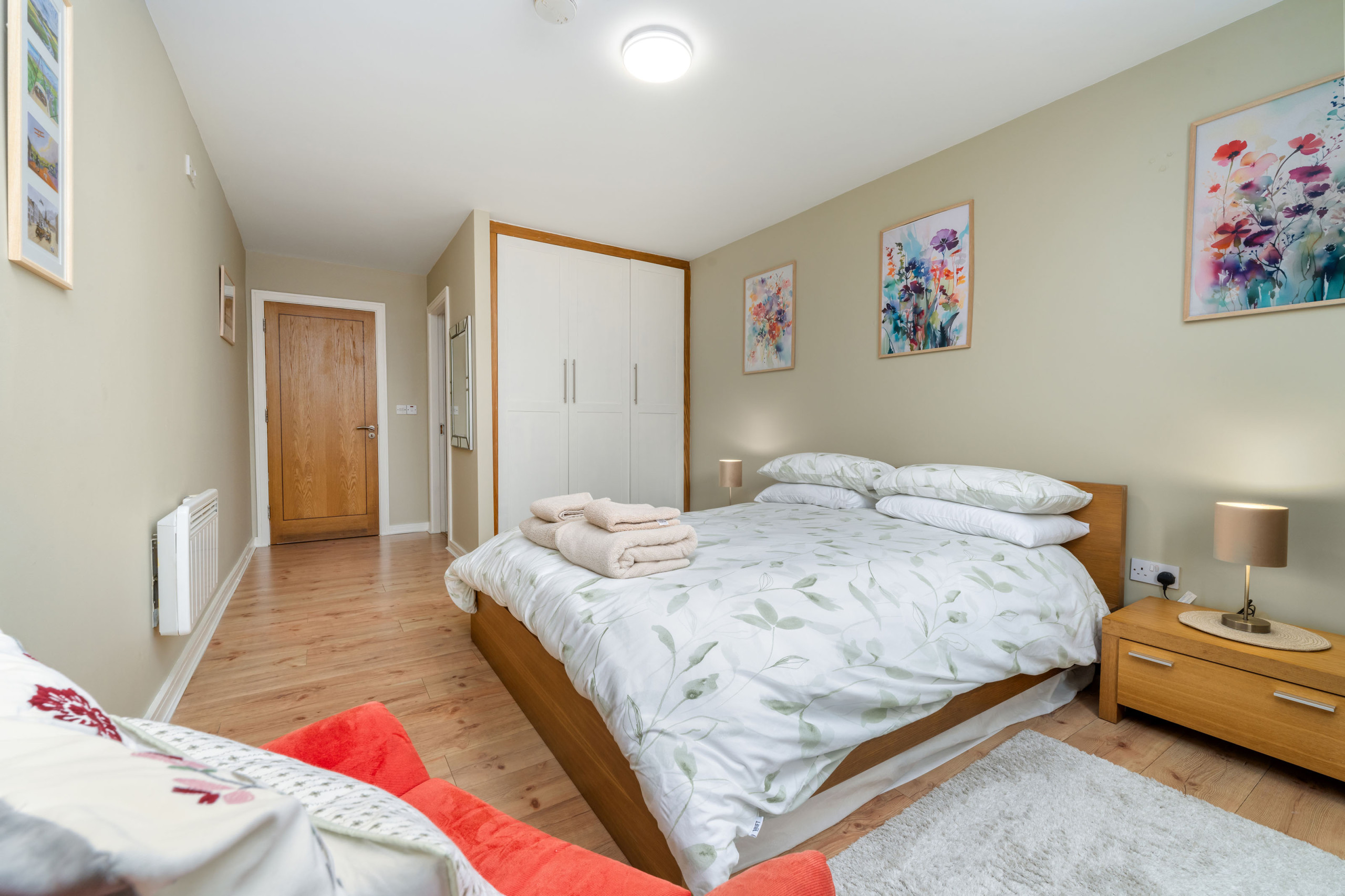 - Bedroom 1: king-size with fitted wardrobes and en-suite bathroom (shower, sink, WC)