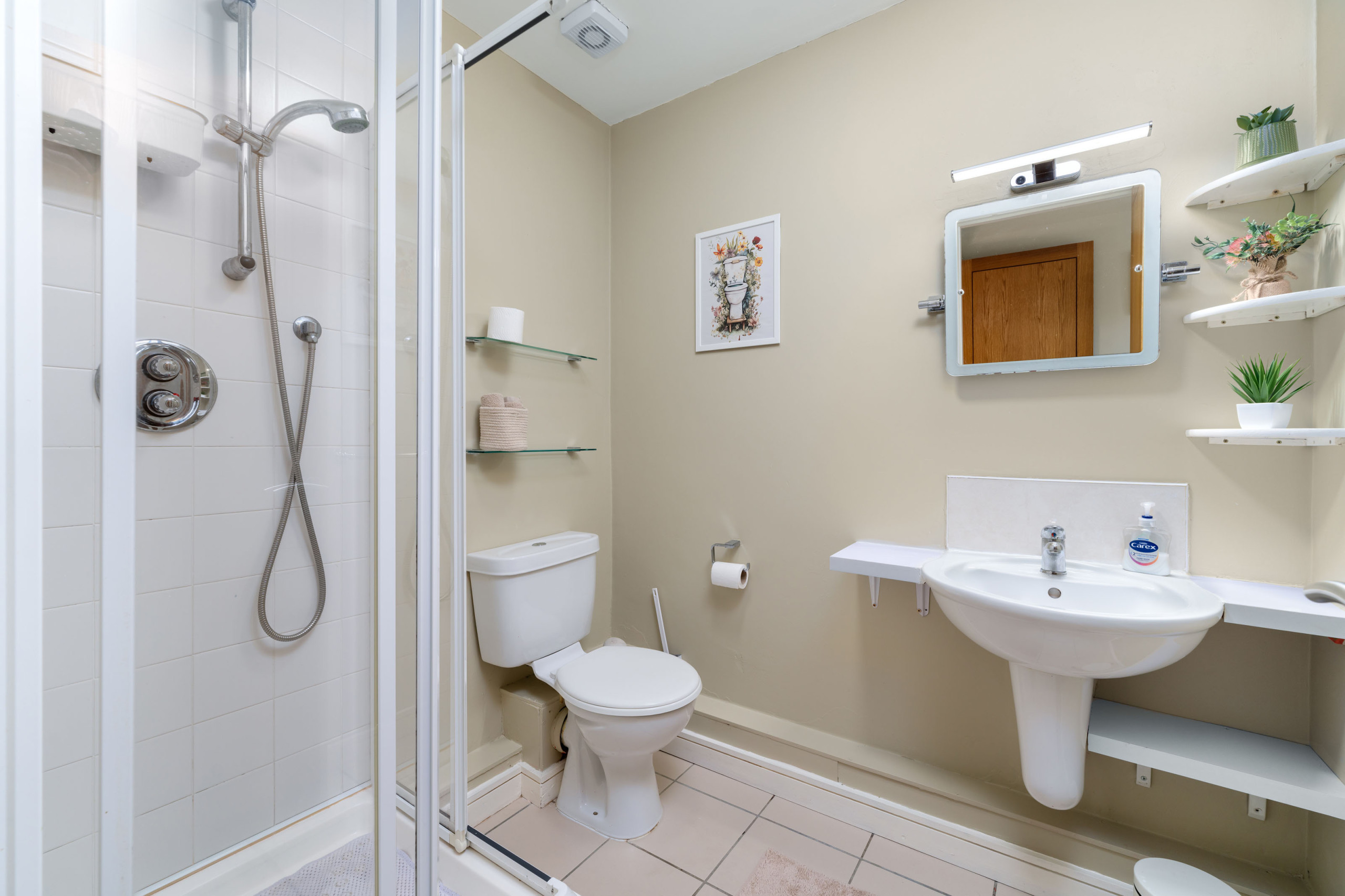- Main bathroom with shower over bath, WC, and sink