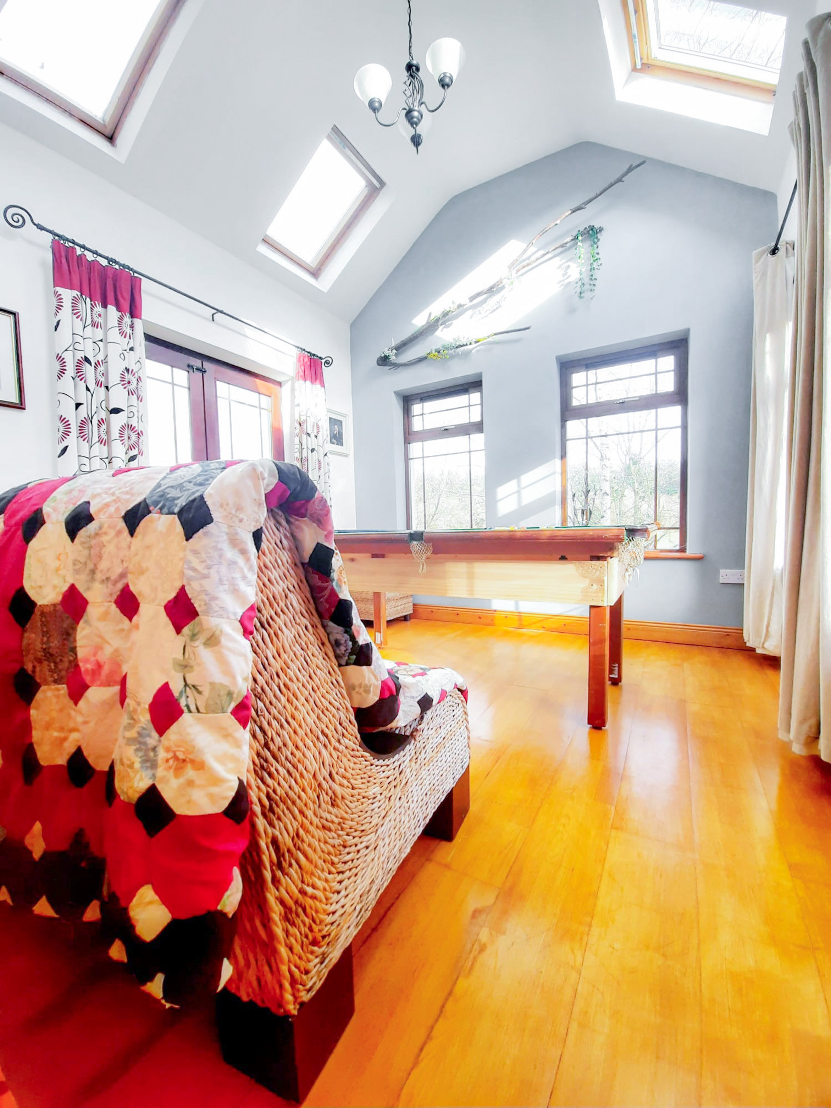 - Spacious living room with smart TV, solid fuel stove and pool table.