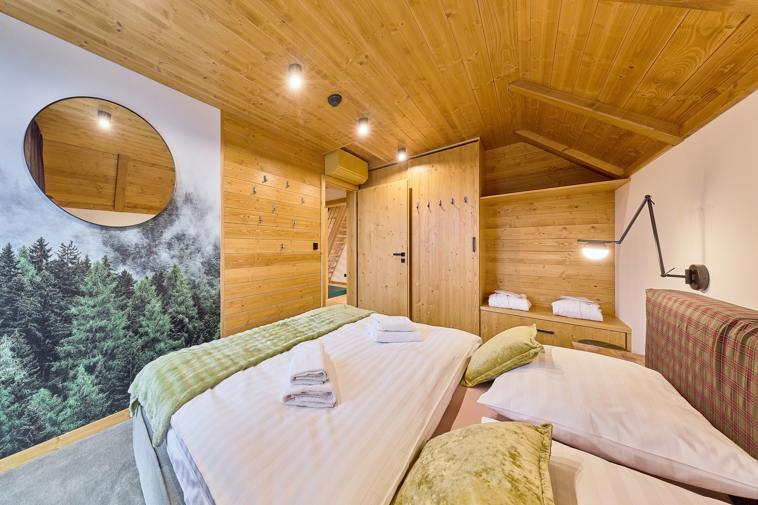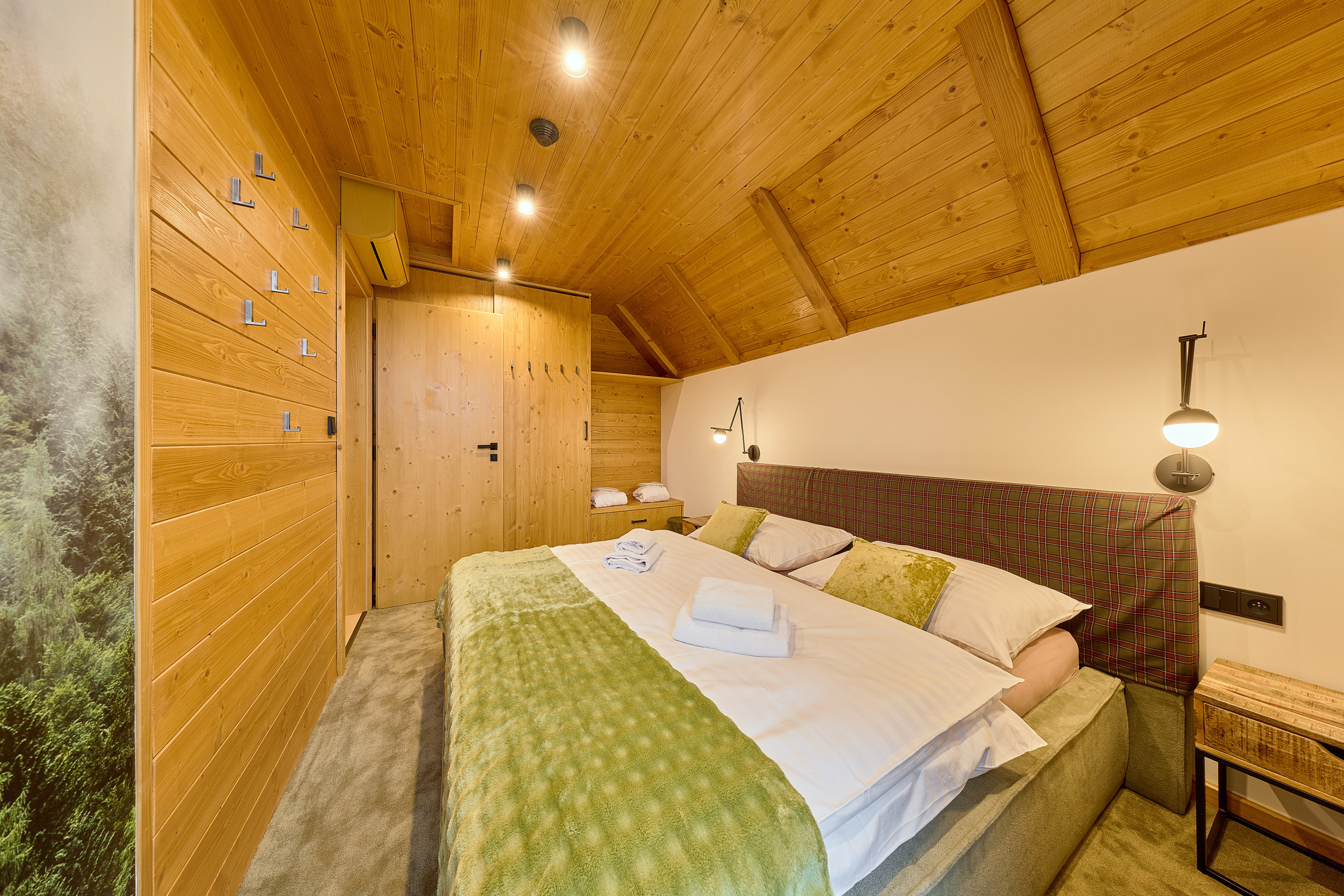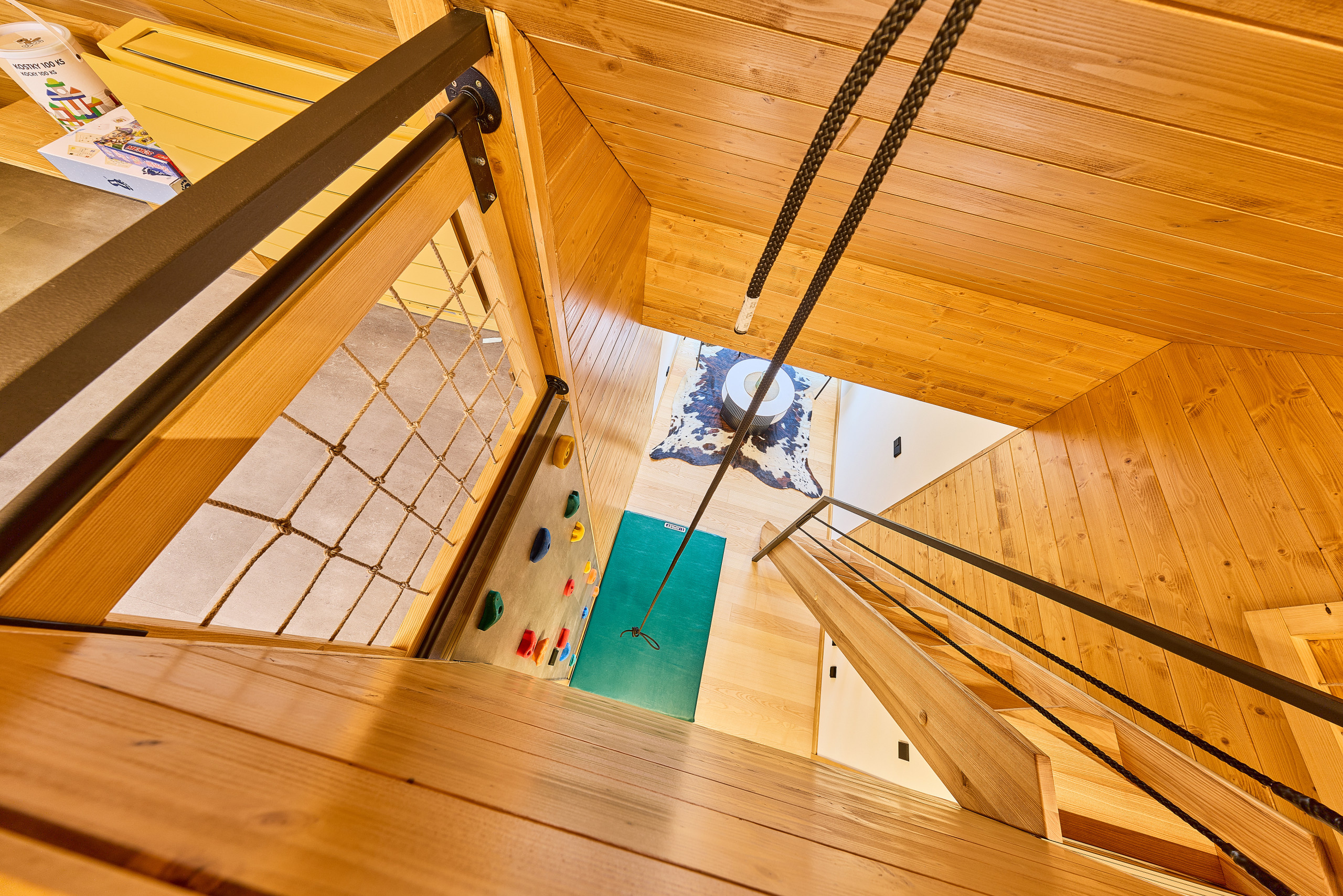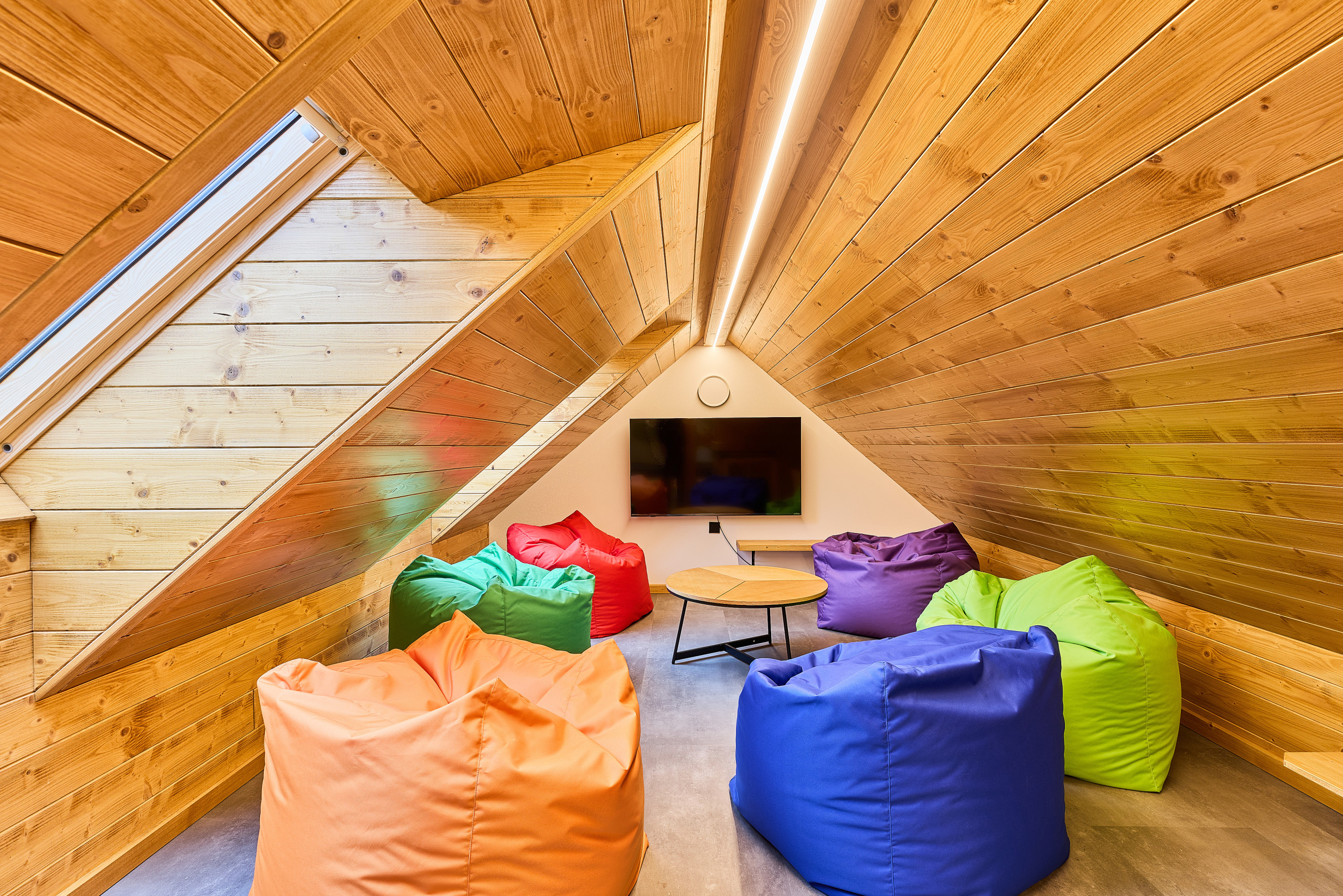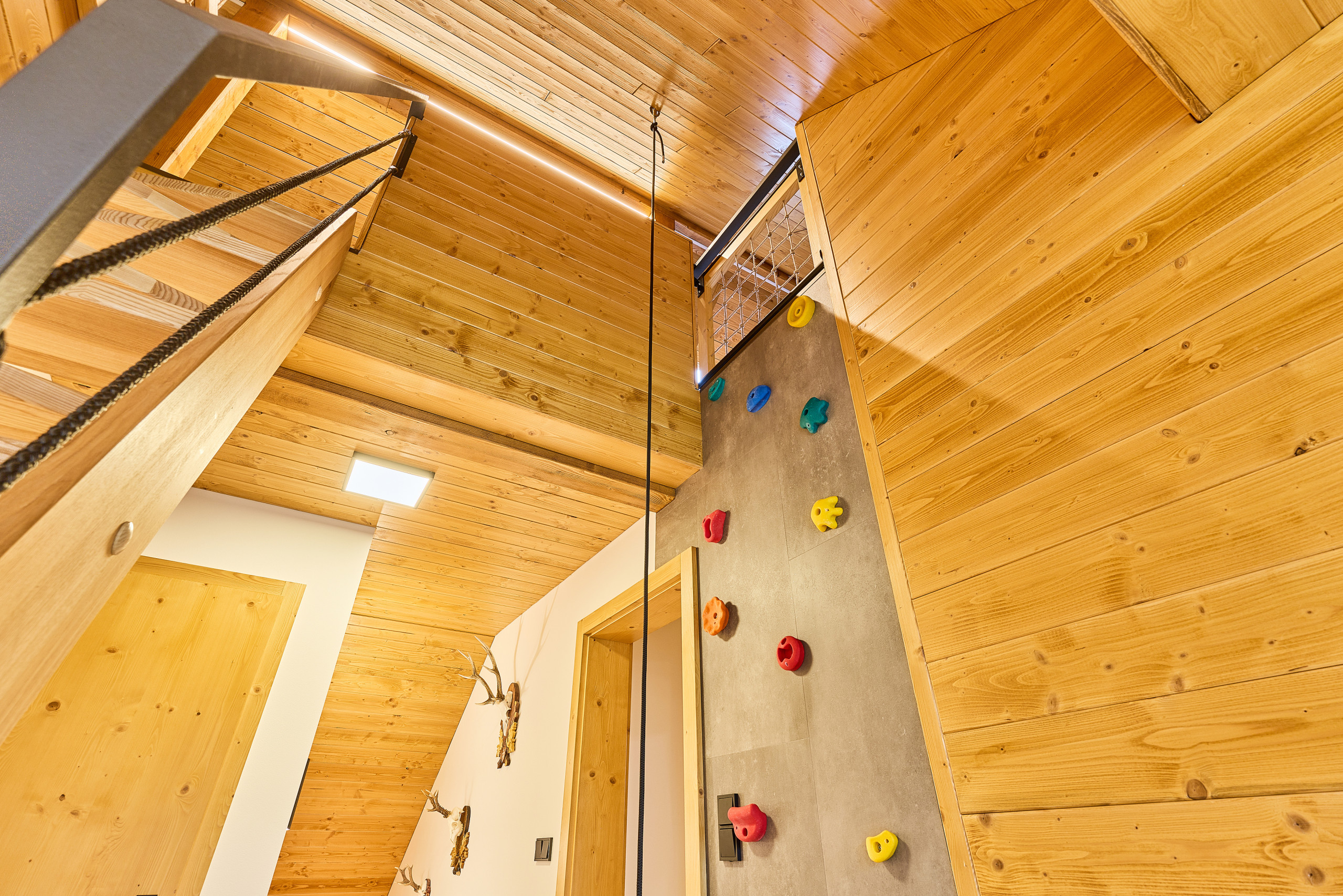 Boven zijn nog twee moderne badkamers, beide met douche en toilet. Zo heeft iedereen genoeg privacy en hoef je nooit lang te wachten. De zolder voelt bijna als een eigen speelhuis: een ruime relax- en gameroom met TV, gameconsole, zitzakken en zelfs een klimwand om naar boven te klimmen. Kinderen zijn hier uren zoet, en volwassenen eerlijk gezegd ook. In de technische ruimte kun je al je wintersportkleding, ski’s en skischoenen laten drogen voor de volgende dag.
