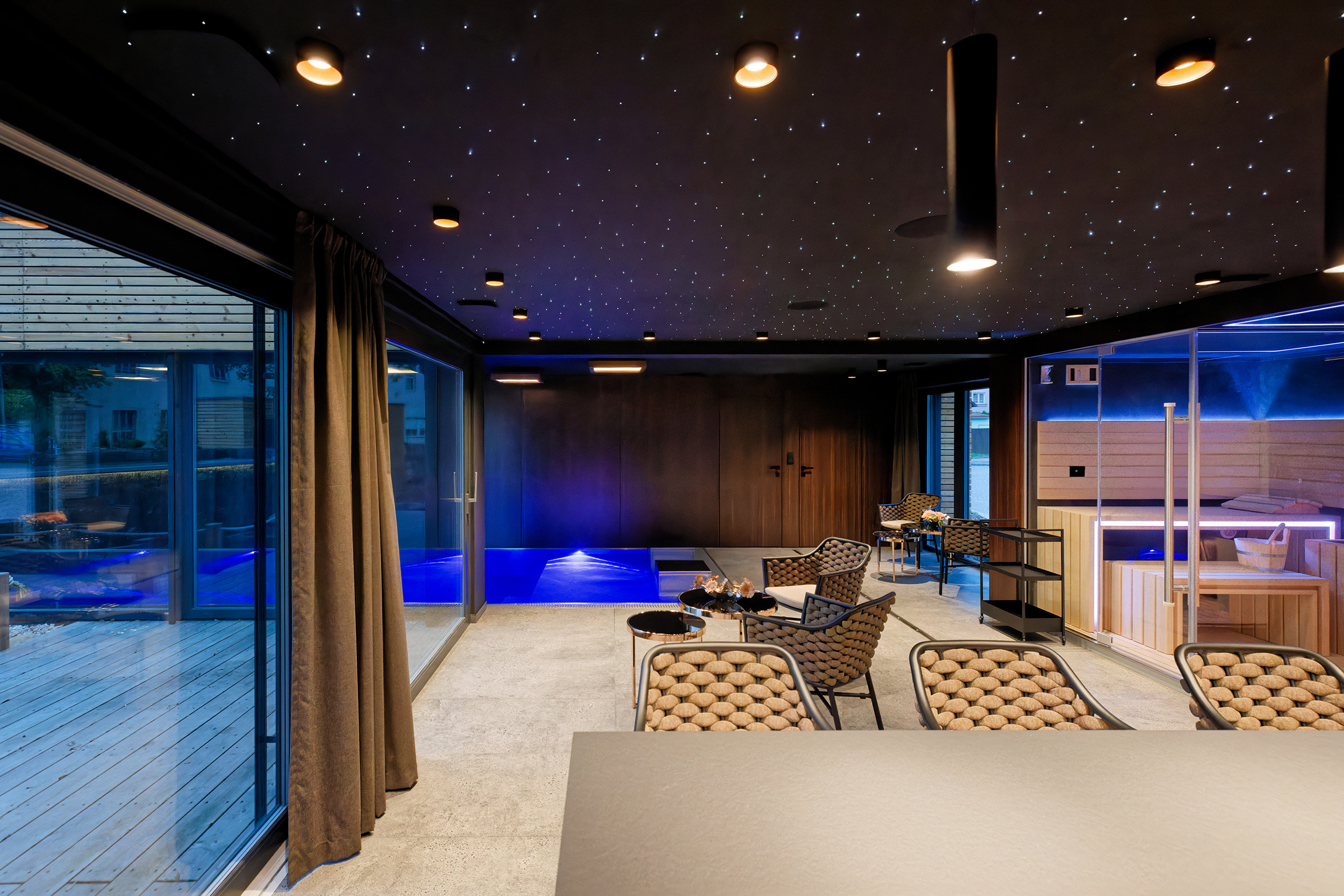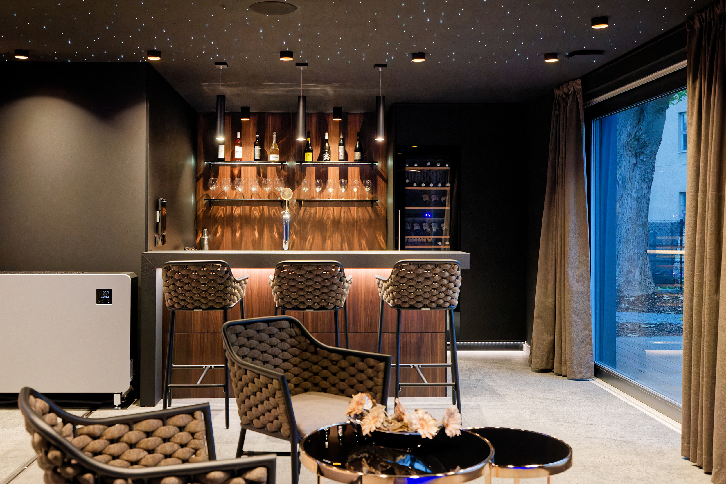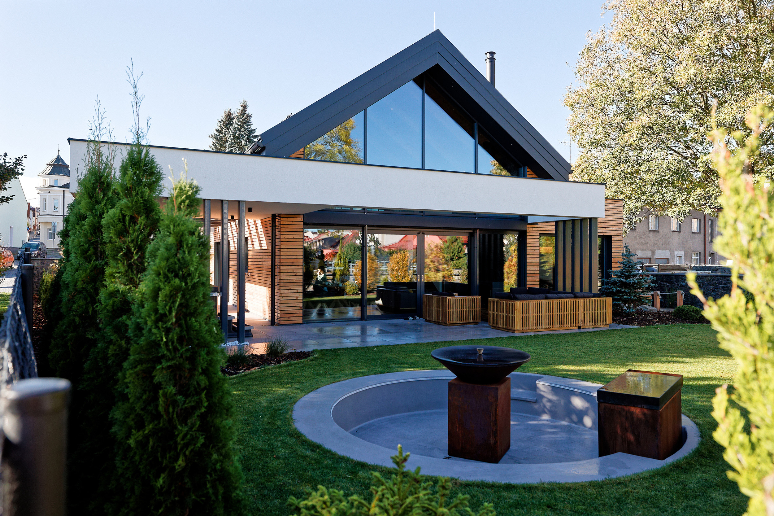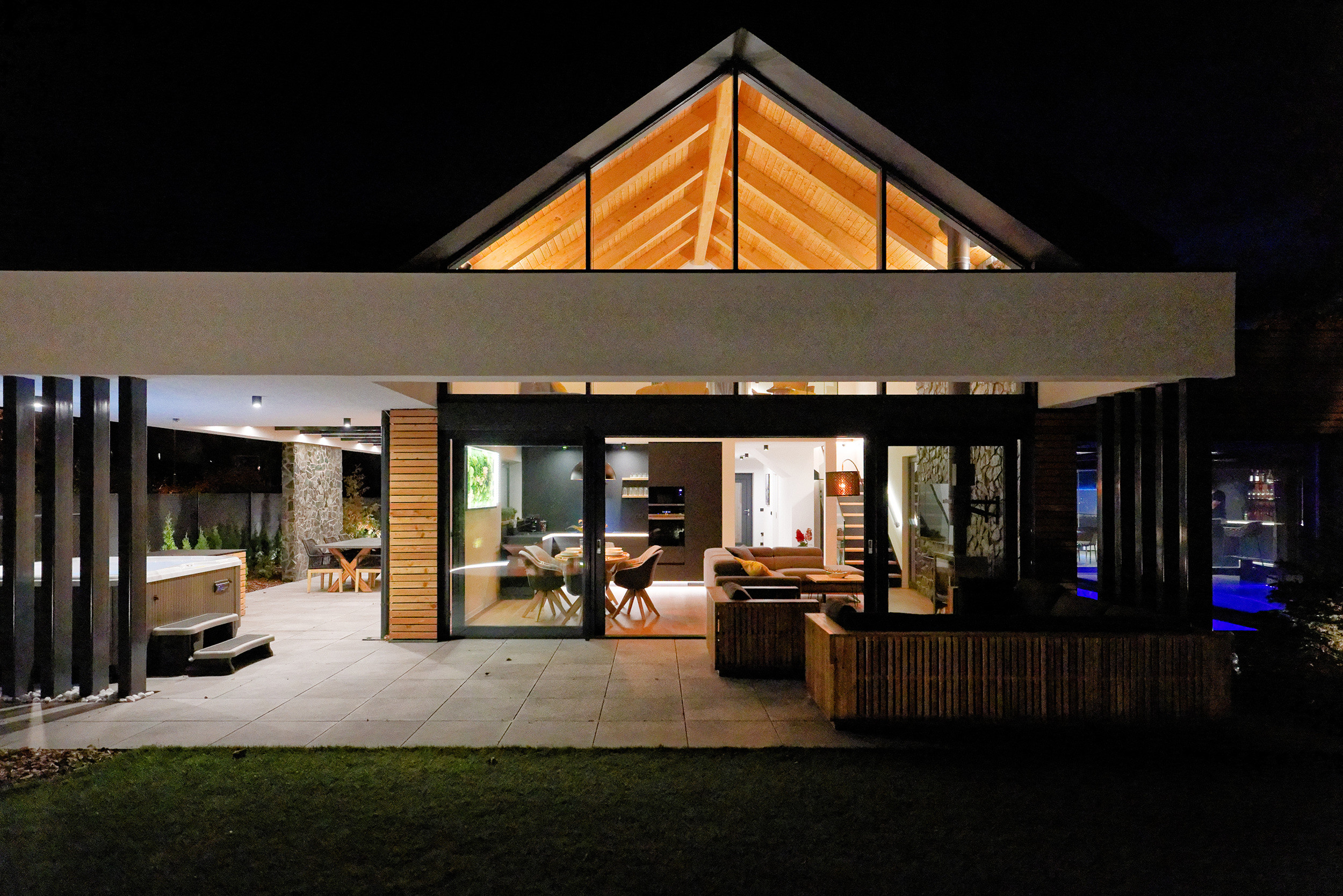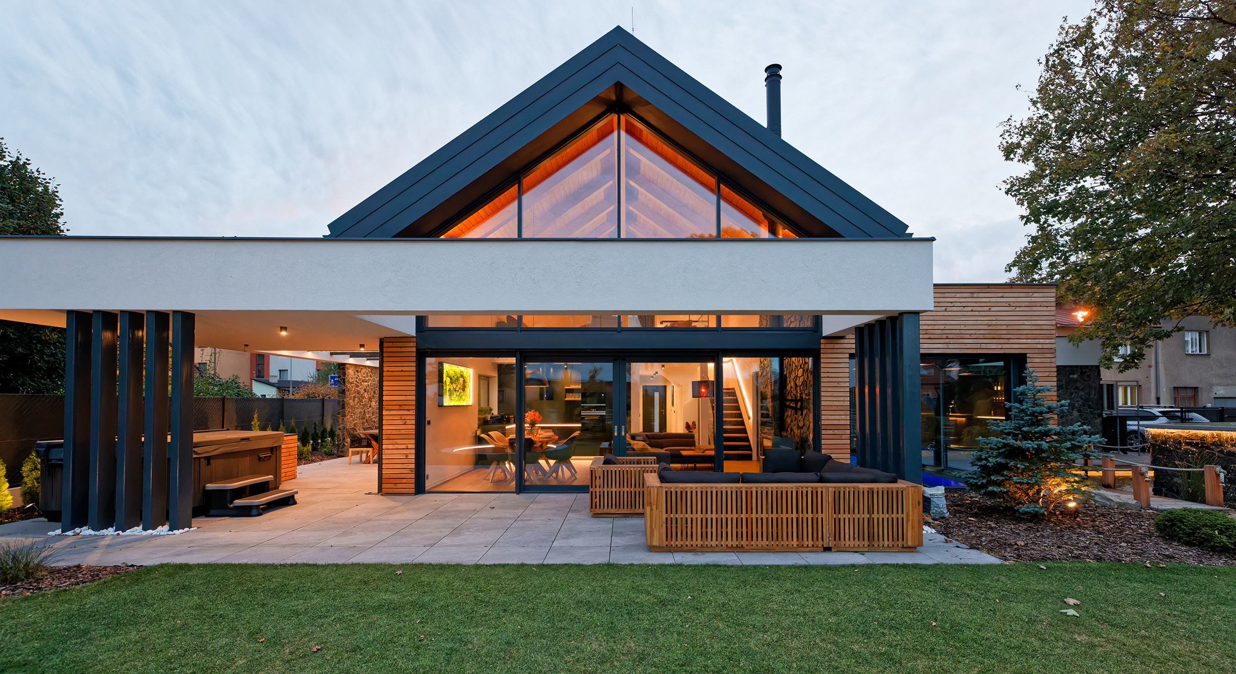 De ruime tuin biedt volop privacy en comfort. Geniet van je ochtendkoffie op de luxe loungeset of organiseer een gezellige avondmaaltijd aan de grote eettafel. De sfeervolle Ofyr-haard is perfect voor een glas wijn terwijl je geniet van het knisperende vuur. Voor de actieve gasten is er een aparte berging voor fietsen en ski’s, zodat je eenvoudig op pad kunt voor avontuur in de natuur, zowel in de zomer als winter.