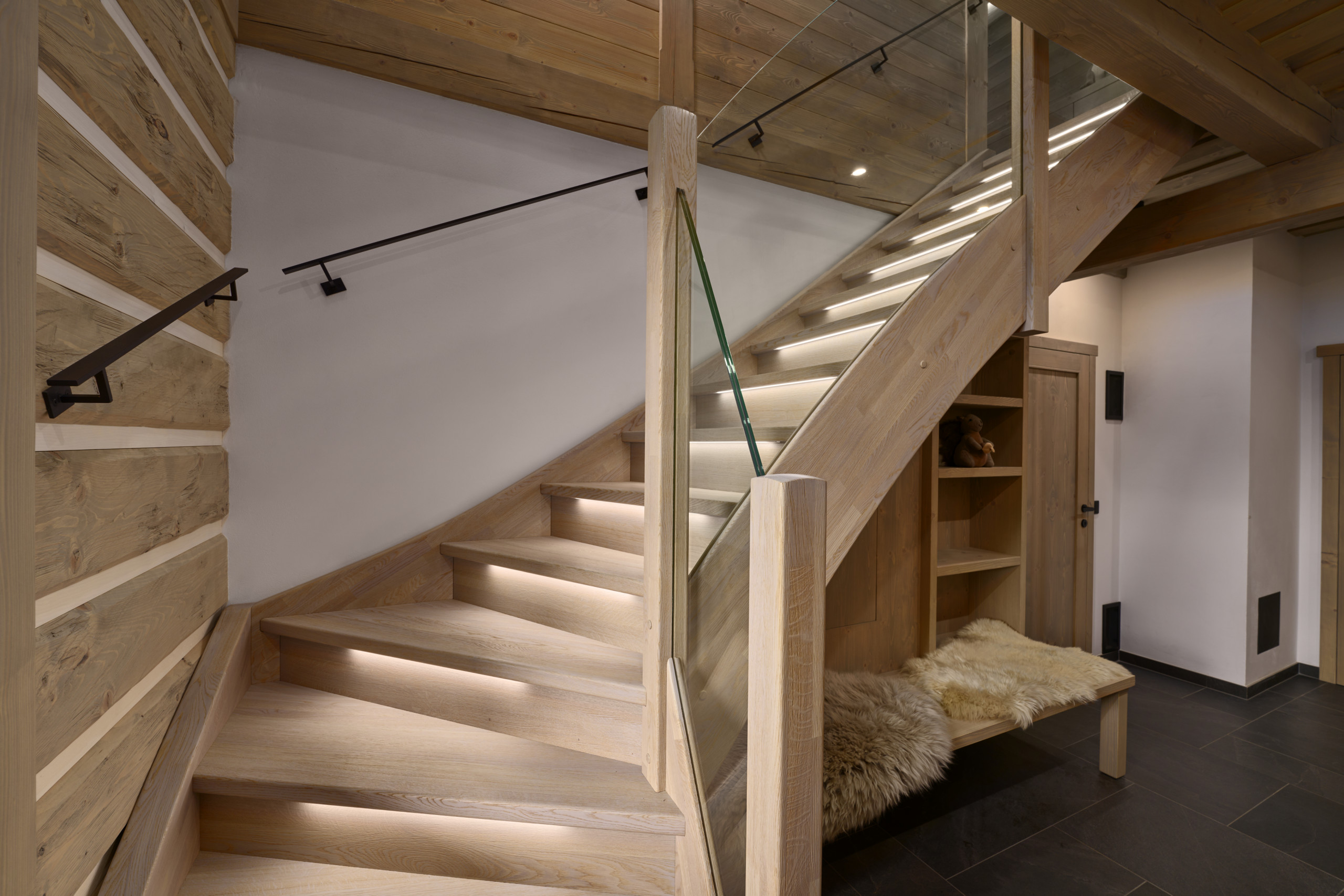 Binnen heerst een warme, huiselijke sfeer. De ruime woonkamer met open haard is ideaal voor lange avonden samen, terwijl de compleet ingerichte keuken uitnodigt om uitgebreid te koken en te tafelen. Het chalet beschikt over vijf comfortabele slaapkamers, drie badkamers, vier toiletten en een praktische ruimte om schoenen en outdoor kleding te drogen. Alles is ingericht met oog voor gemak en ontspanning.