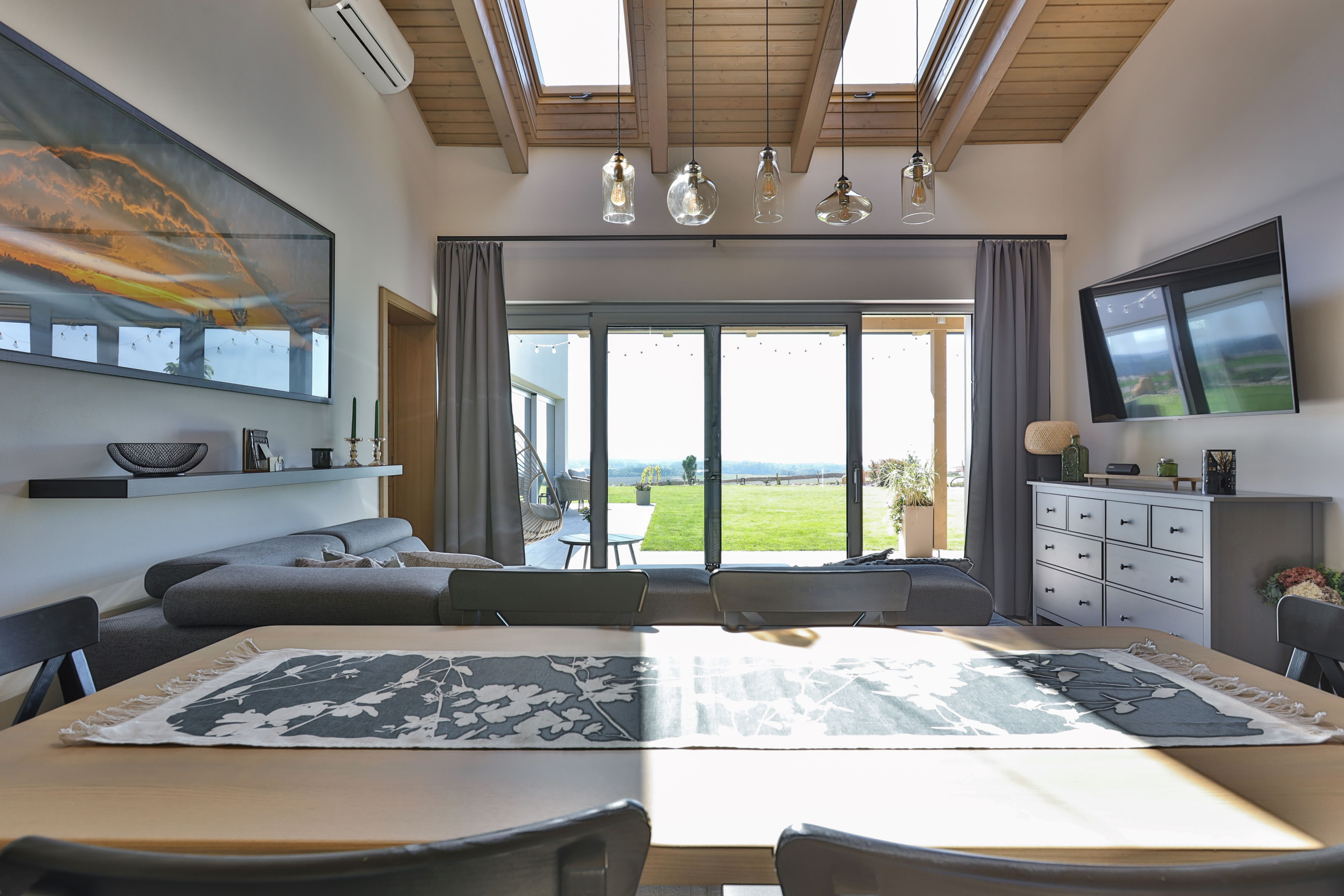 Het huis is perfect voor gezinnen, vrienden of een kleine groep. Twee fijne slaapkamers met grote bedden en extra slaapmogelijkheden. Voor kleine kinderen is er een babybedje beschikbaar. De woonkamer met open keuken is ruim en gezellig, met een grote eettafel en een panoramisch uitzicht dat elke maaltijd bijzonder maakt. De keuken is volledig uitgerust. Van een Amerikaanse koelkast met ijsblokjesmachine tot een Nespresso-machine met capsules, bakspullen en de basisvoorraad die je thuis ook fijn vindt. Je hoeft niets mee te slepen.