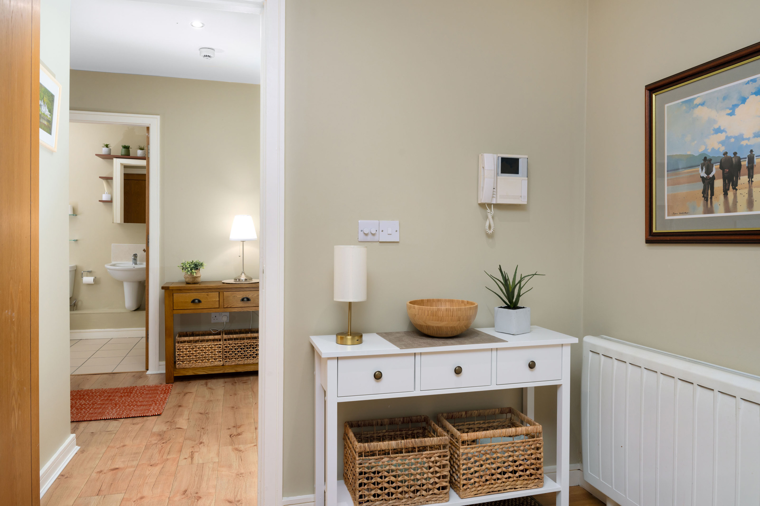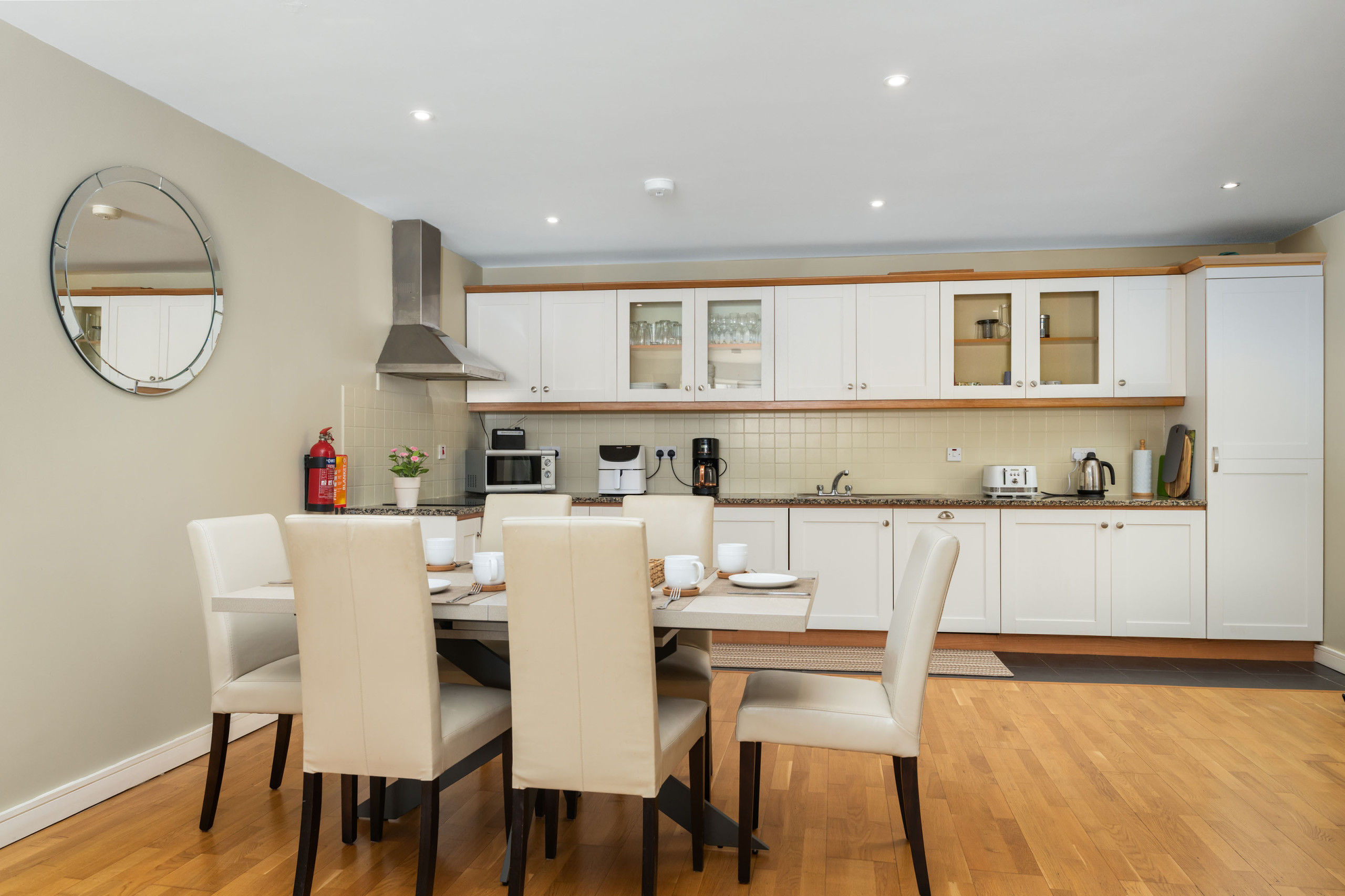 - Fully equipped kitchen with electric oven & hob, microwave, kettle, toaster, dishwasher, integrated fridge freezer, and washing machine