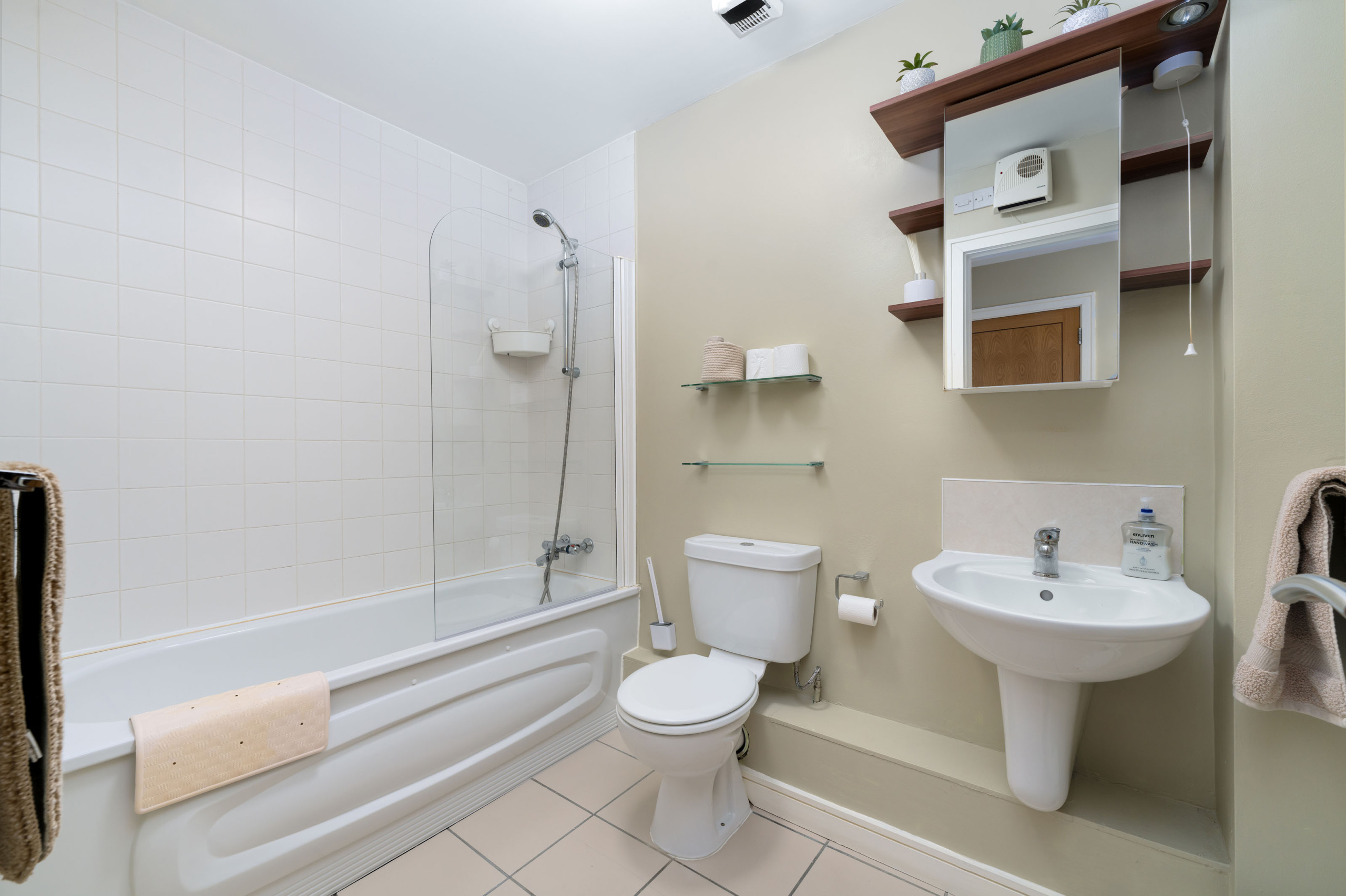- Main bathroom with shower over bath, WC, and sink
