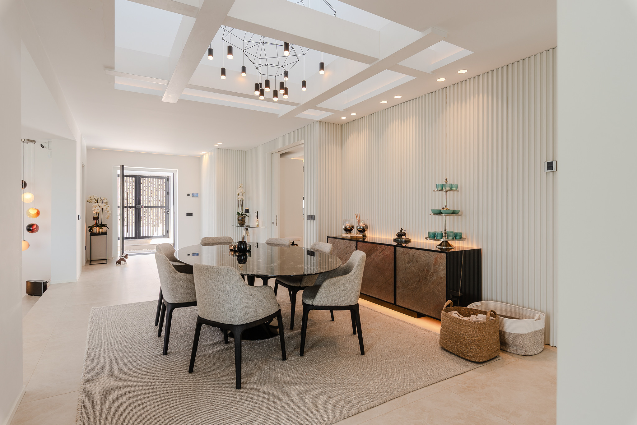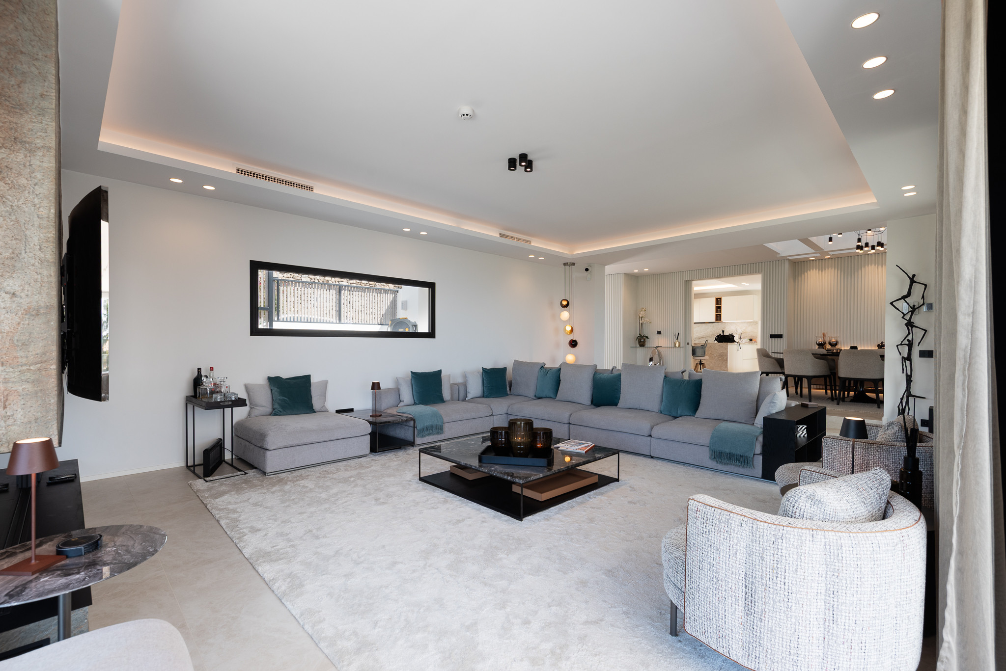 A través de la puerta principal se entra en un espacioso vestíbulo con acceso directo a la zona de comedor precioso y luminoso. A la derecha se encuentra una fantástica sala de estar, con una gran pantalla de televisión y todos los equipos necesarios de HI-FI.