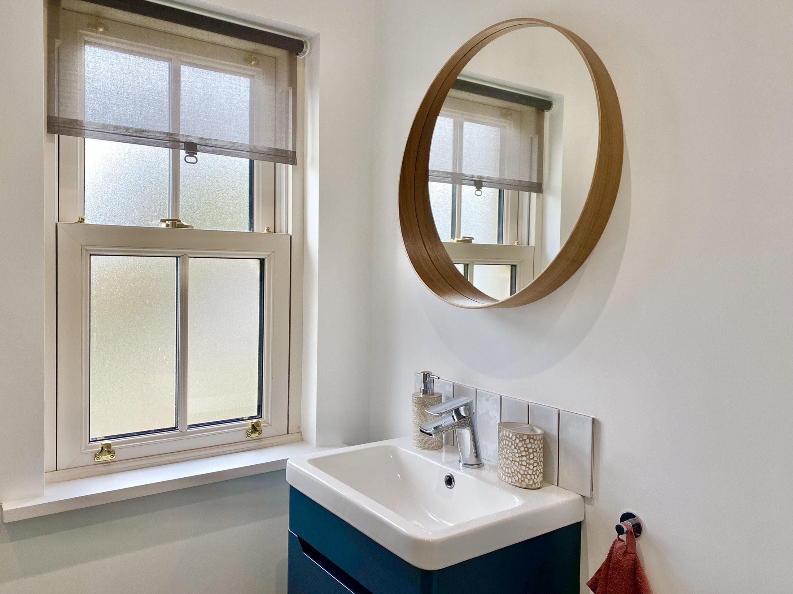 - Family bathroom with large shower with rainfall shower head sink and WC