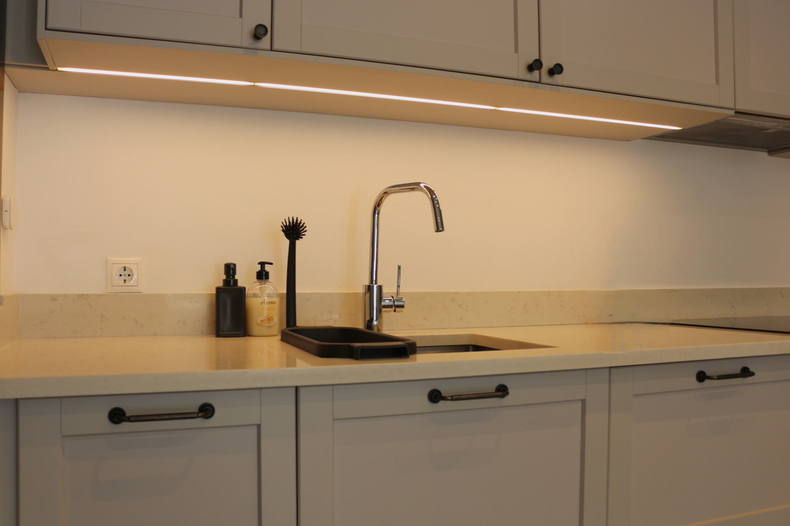 Une cuisine entièrement équipée avec lave-vaisselle, four, micro-ondes, réfrigérateur et machine à laver