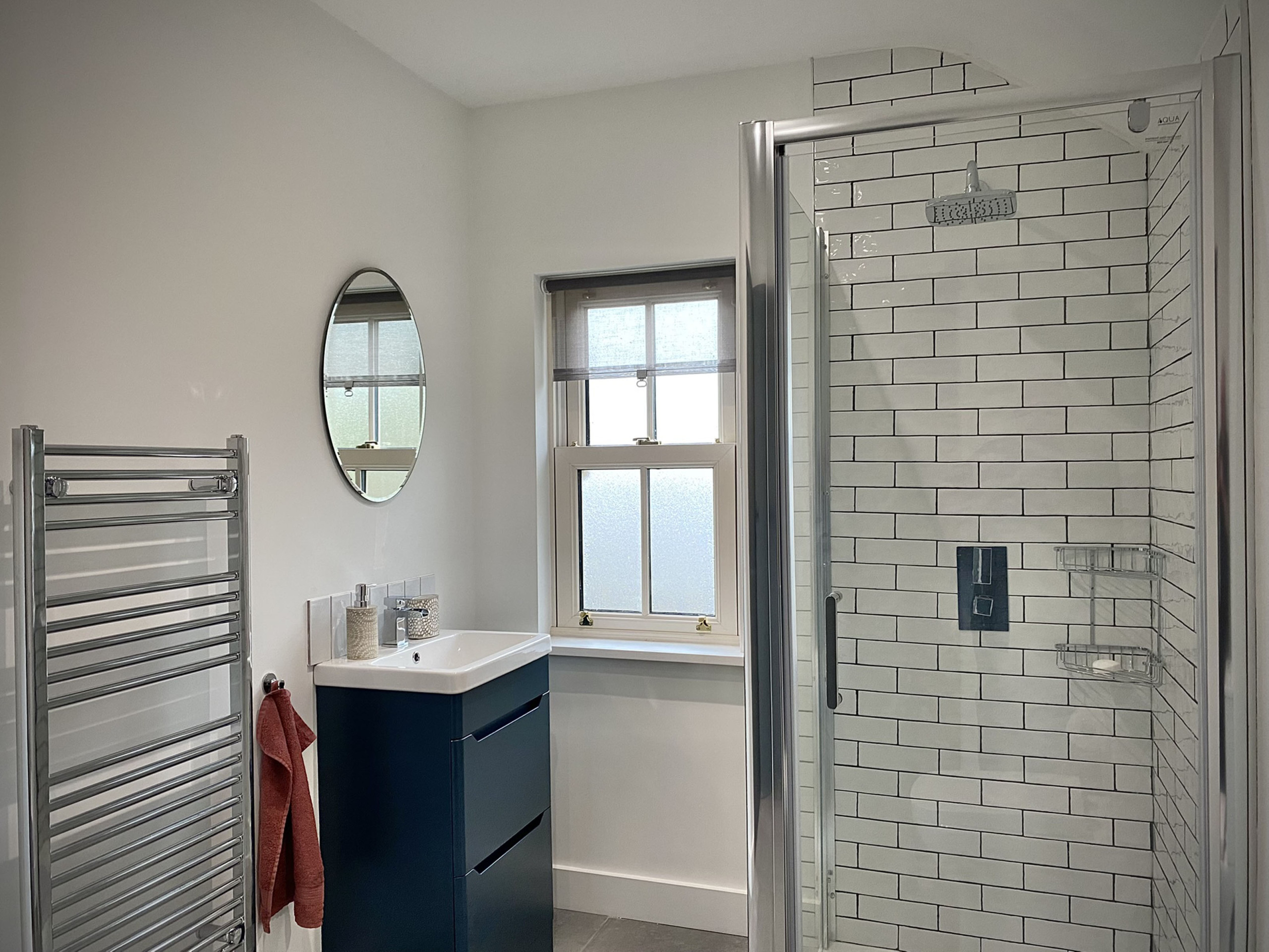 - Family bathroom with large shower with rainfall shower head sink and WC