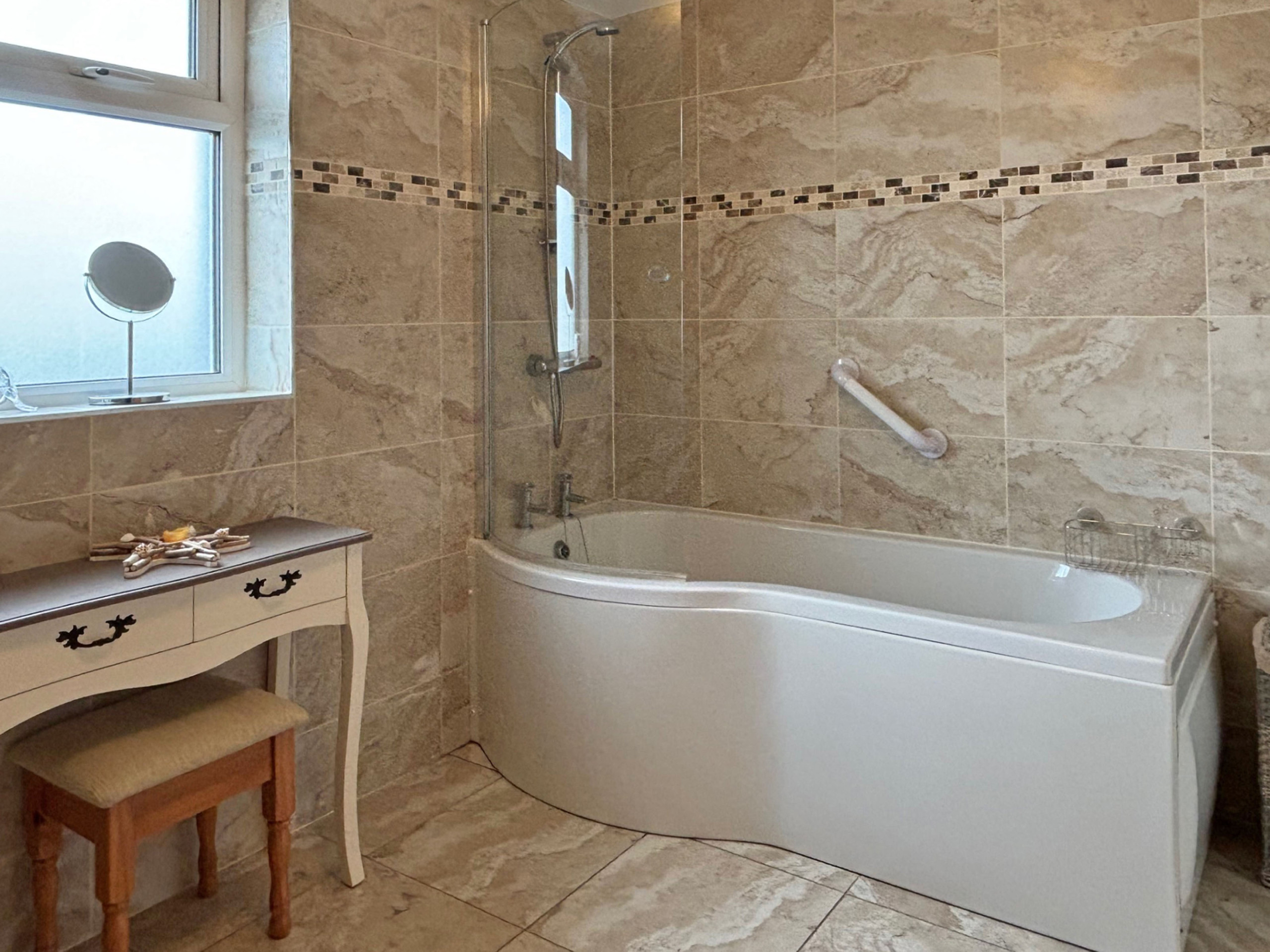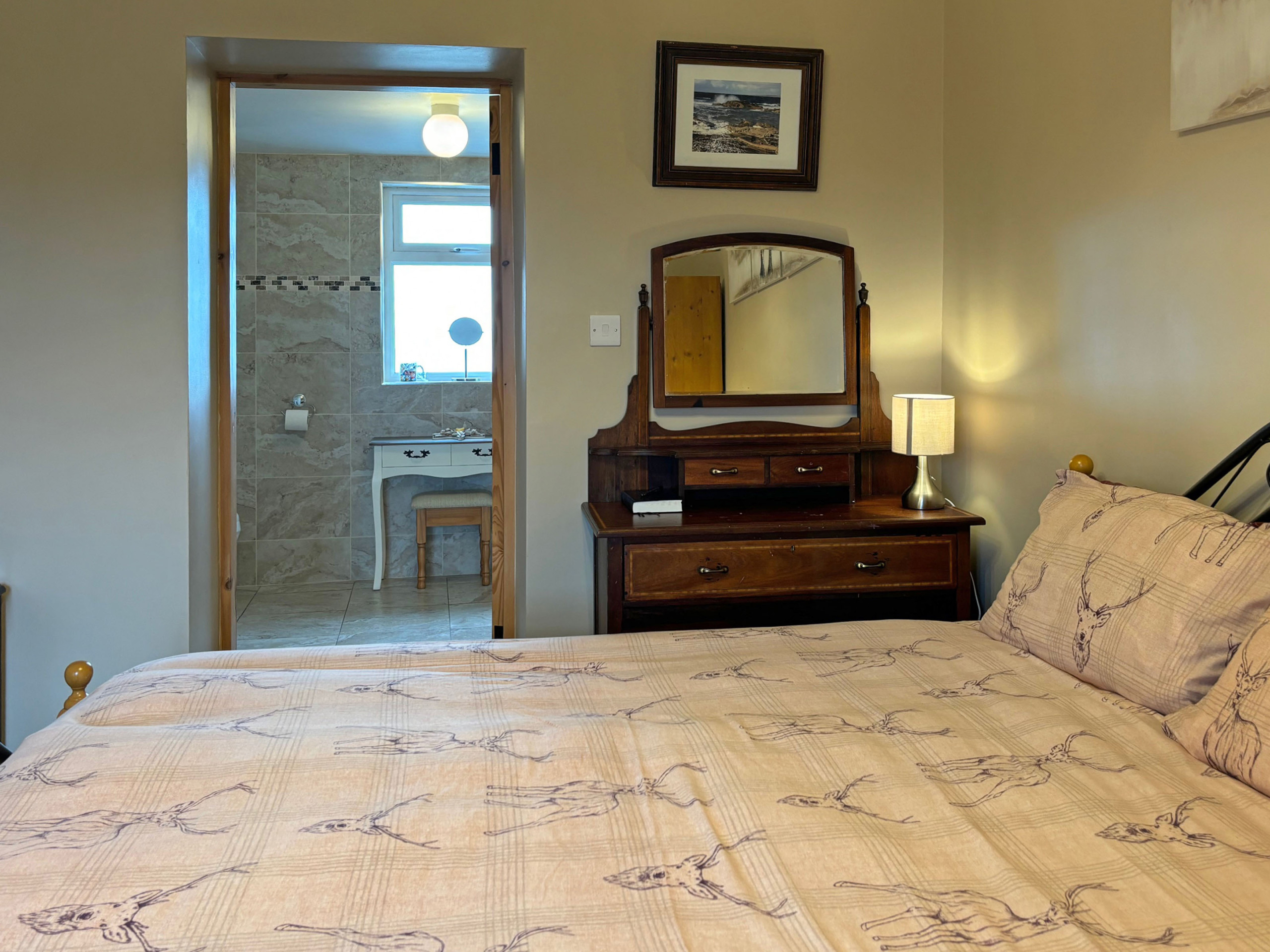 - Bedroom 1: double with large ensuite (shower over bath, WC, sink, and dressing table) sleeping 2