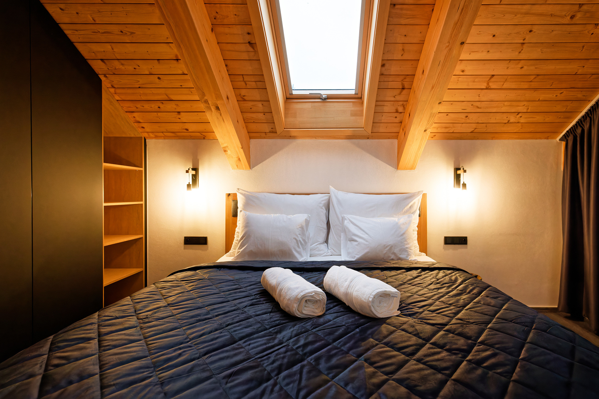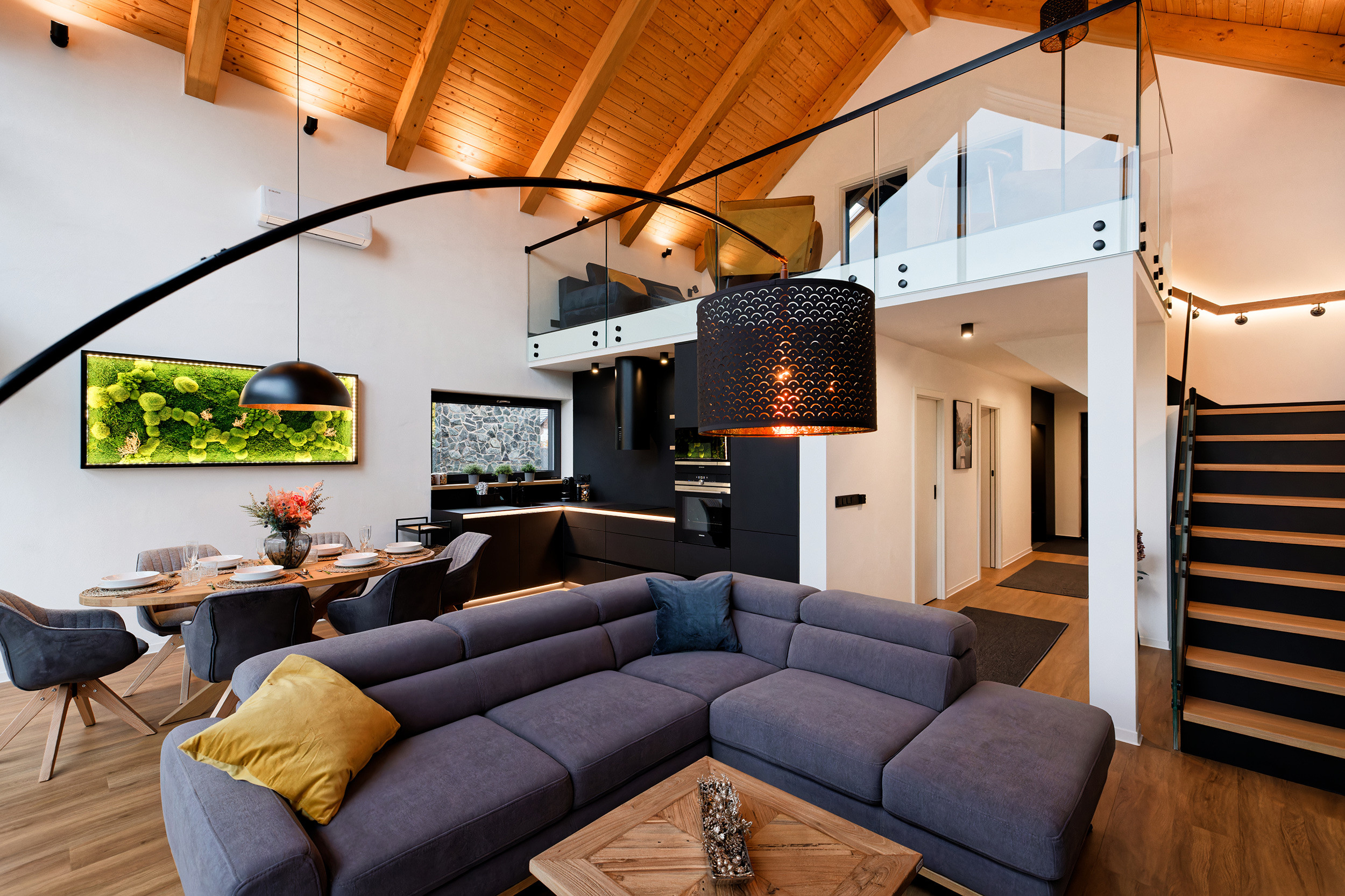 Inside, you’ll find a warm, modern interior that invites you to feel at home right away. The cozy living room, featuring a crackling fireplace and a large TV, is perfect for relaxing evenings. The open-plan kitchen is fully equipped with everything needed for delightful meals with family or friends. Three comfortable bedrooms and two stylish bathrooms ensure a carefree stay, while the additional sitting area upstairs, complete with a sofa bed, provides extra space for a guest or a quiet retreat.