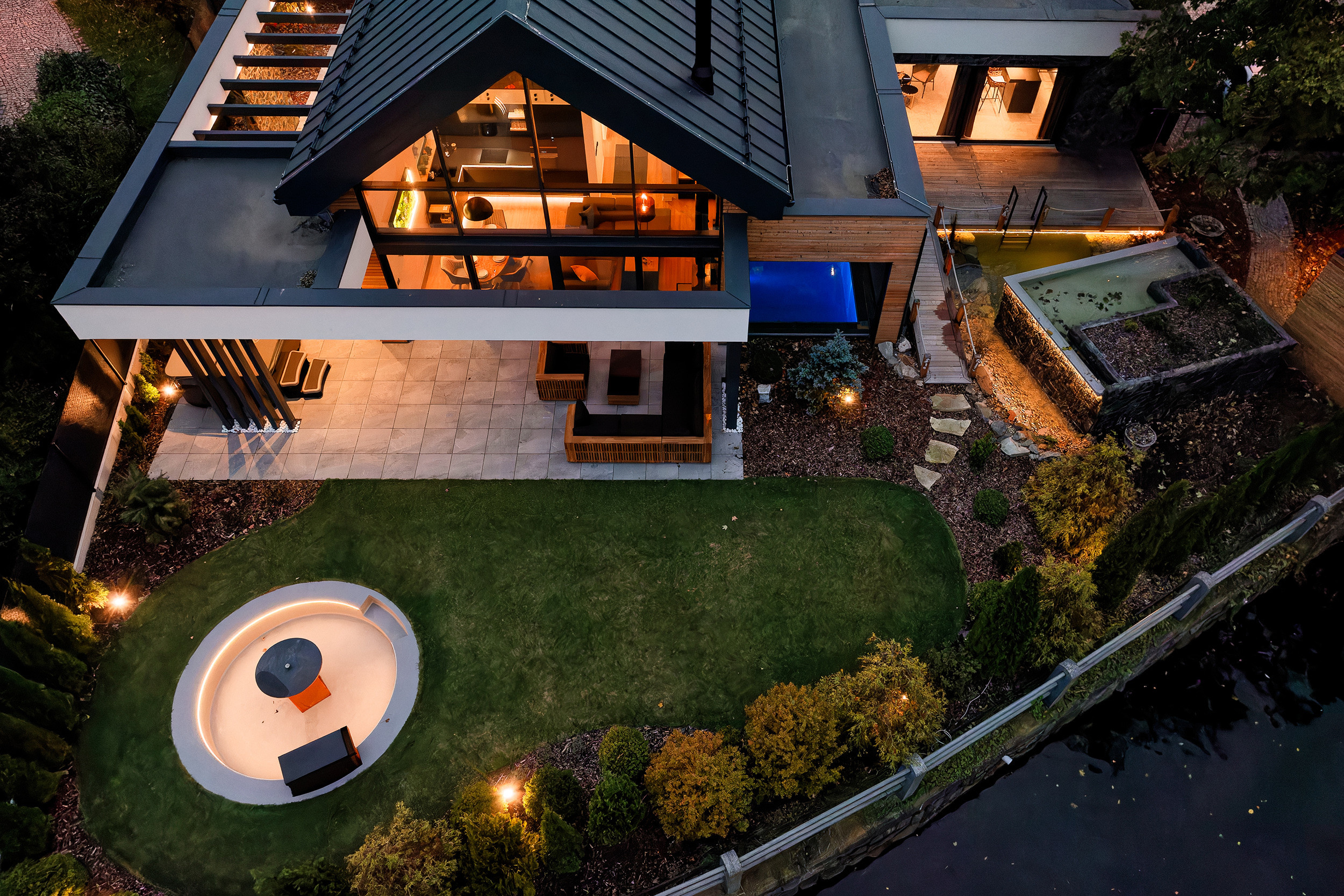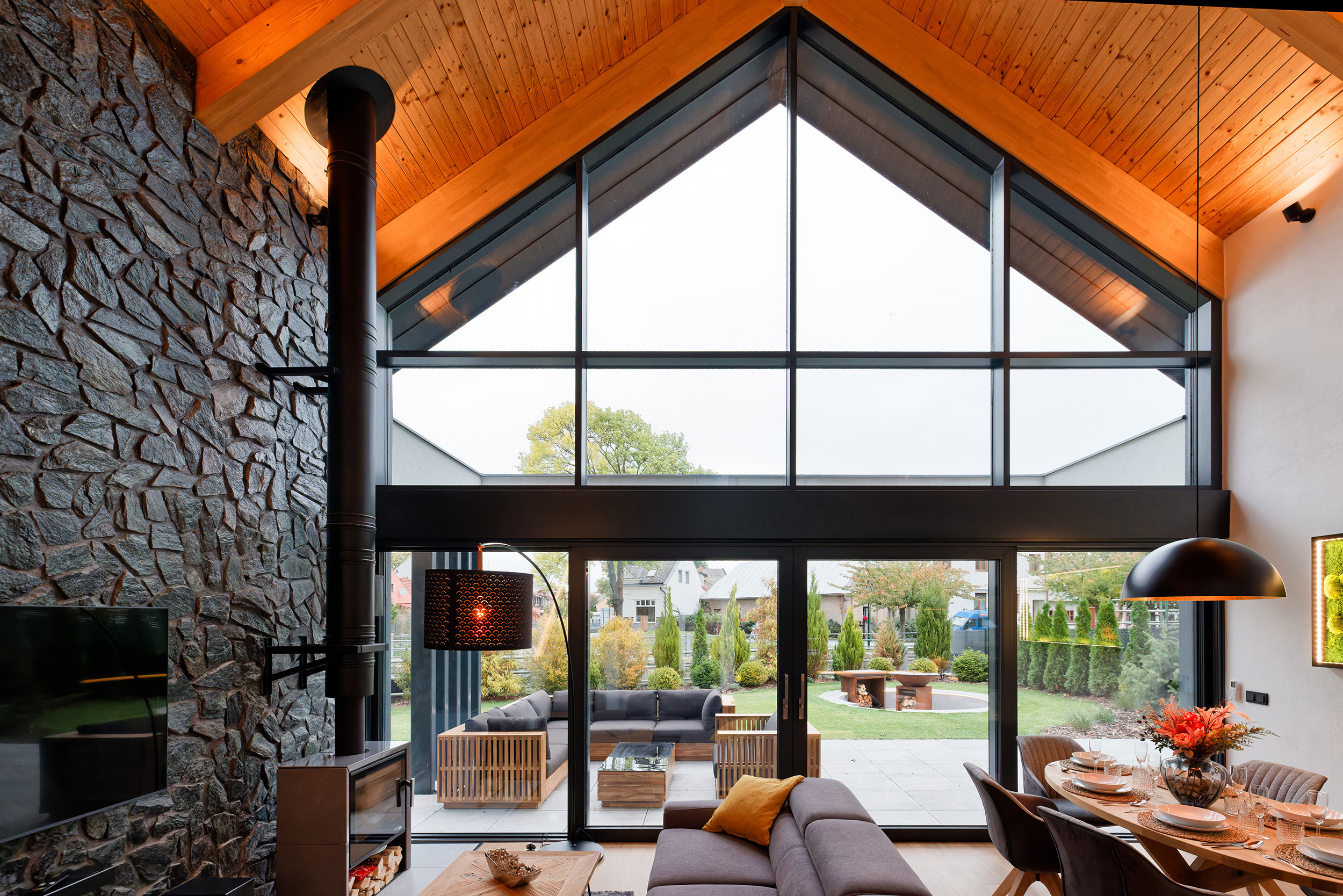 The spacious 630-square-meter garden offers plenty of privacy and comfort. Enjoy your morning coffee on the luxurious lounge set or host a cozy dinner at the large outdoor dining table. The inviting Ofyr fireplace is perfect for unwinding with a glass of wine while watching the flickering flames. For active guests, a separate storage room for bicycles and skis makes it easy to head out for an adventure in nature, whether in summer or winter.