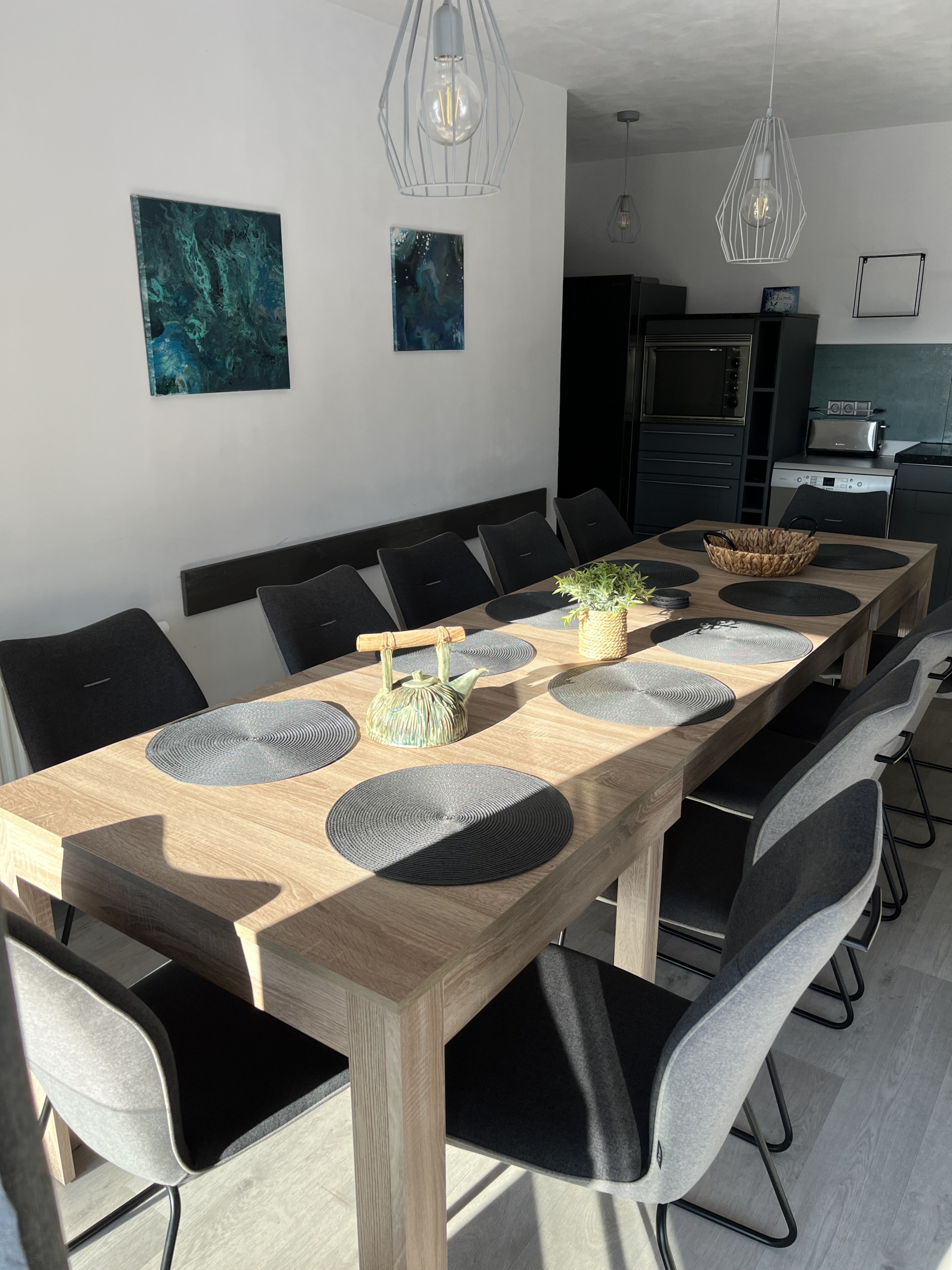 Outside, relaxation and fun await: a large terrace with pergola, a grill for culinary delights, and a charming fire pit. Children can enjoy the inground trampoline, playground equipment, and spacious garden, while sports enthusiasts can play volleyball, badminton, football, or petanque. Everything is designed for both shared enjoyment and peaceful relaxation in nature.