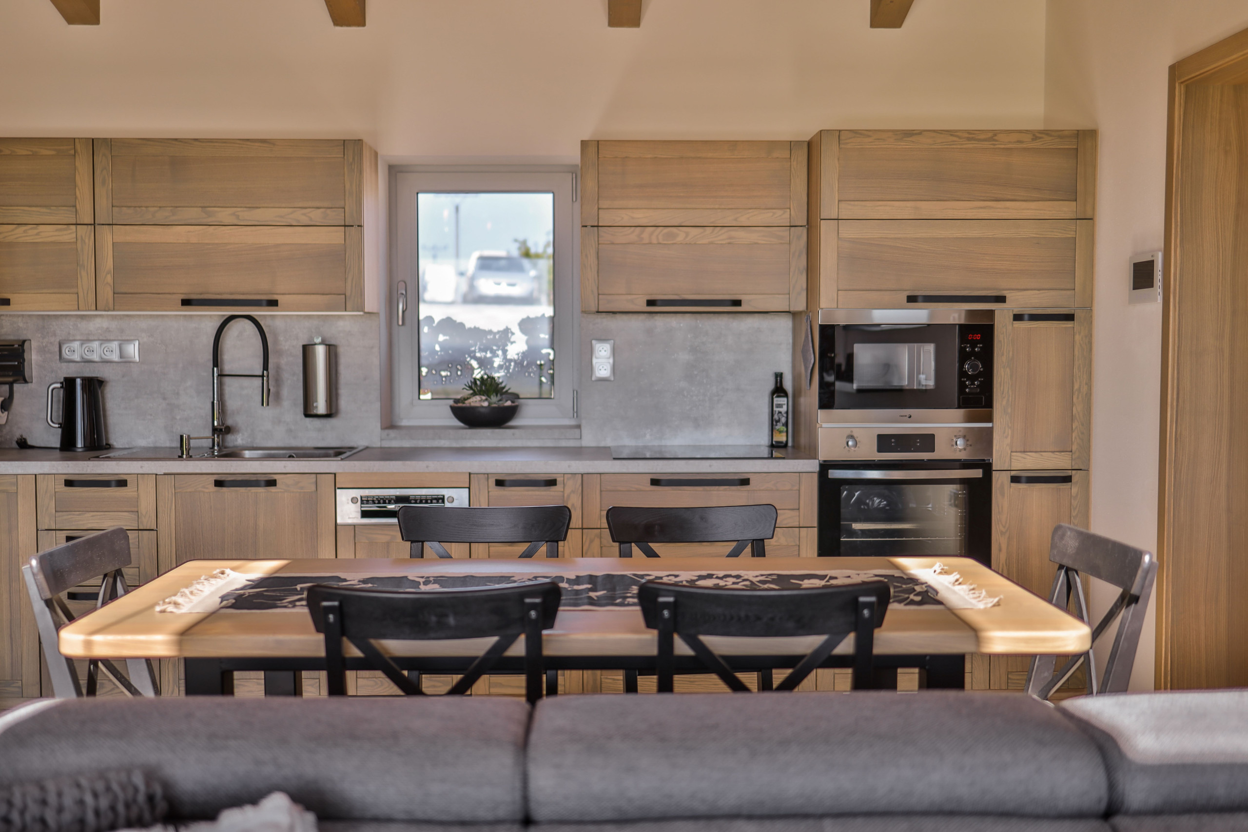 The house is perfect for families, friends or a small group. Two cosy bedrooms with large beds and additional sleeping options. A travel cot is available for small children. The living room with open kitchen is spacious and inviting, with a big dining table and panoramic views that make every meal feel special. The kitchen is fully equipped from an American fridge with ice dispenser to a Nespresso machine with capsules, baking supplies and all the basics you’d want at home. You don’t need to bring a thing.