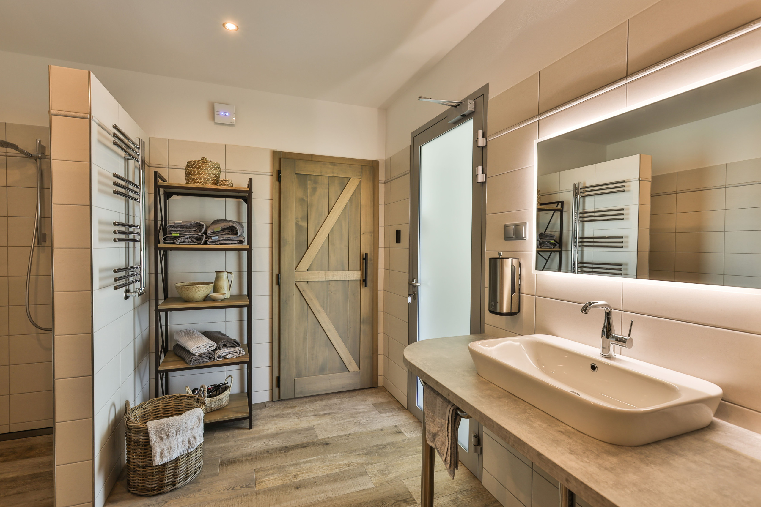 The wellness area connects directly to the living room and features a beautiful indoor pool (30°C), counter-current system, lighting and sliding doors you can open halfway in summer so the indoors and outdoors blend together. In the relaxation area you’ll find loungers, bathrobes, soft towels and sauna sheets, all included.