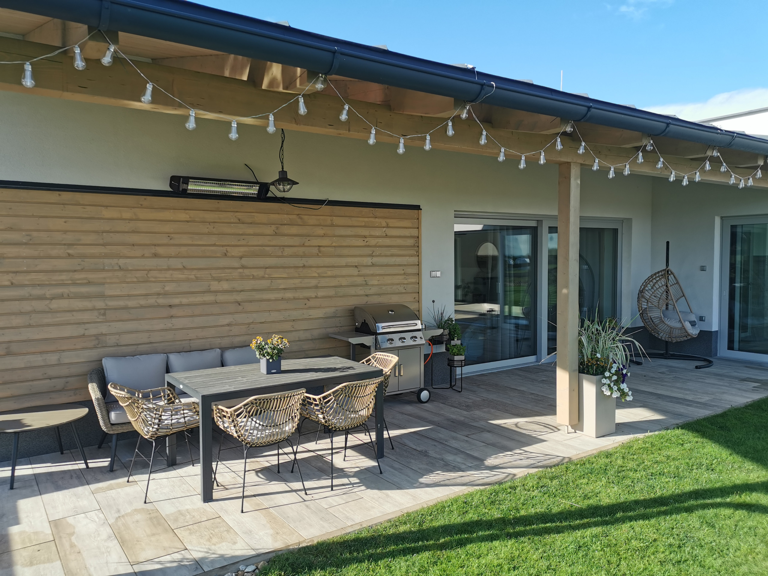 Outside, you’ll find a covered terrace with a large gas grill, comfortable seating and a lovely garden with 300 m² of lawn. For kids or for a bit of fun competition there are games ready: badminton, croquet, pétanque, lazy tennis… Or light up the fire pit and grill something tasty over the flames.